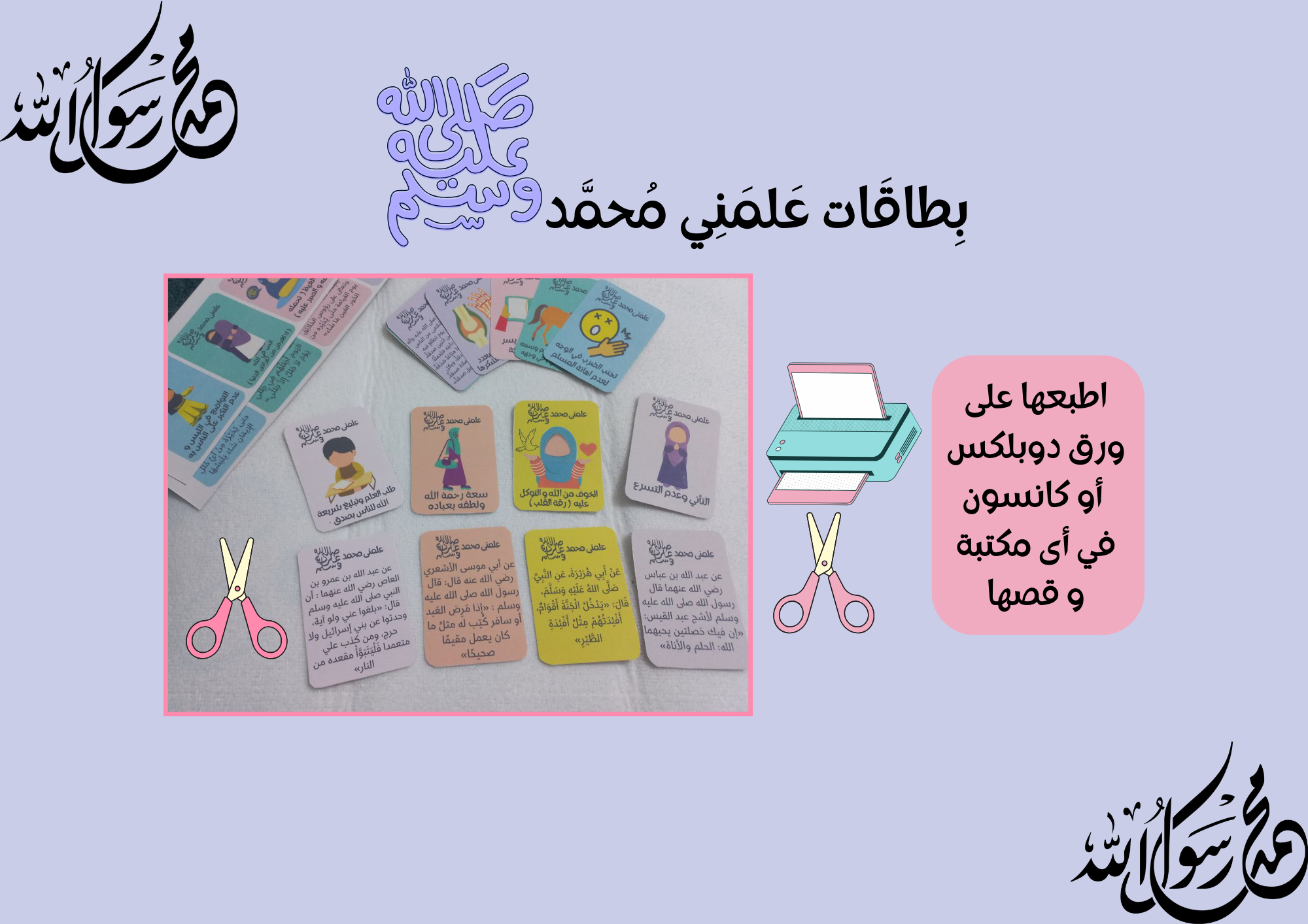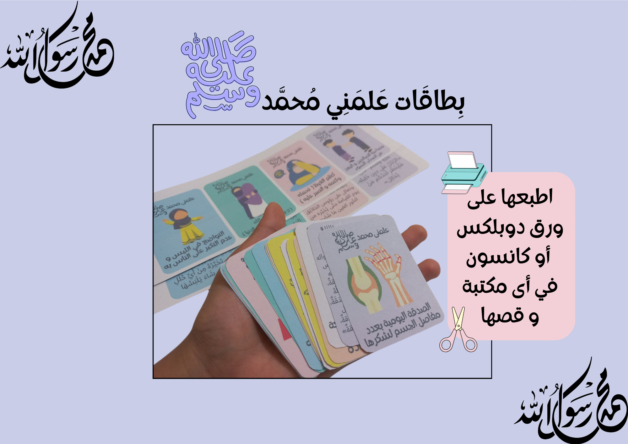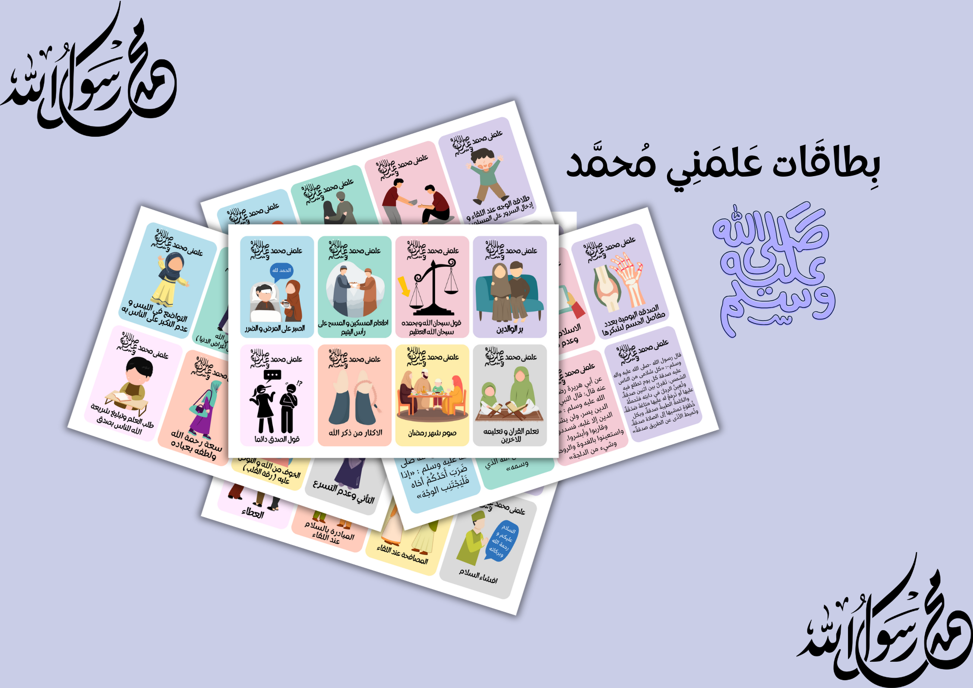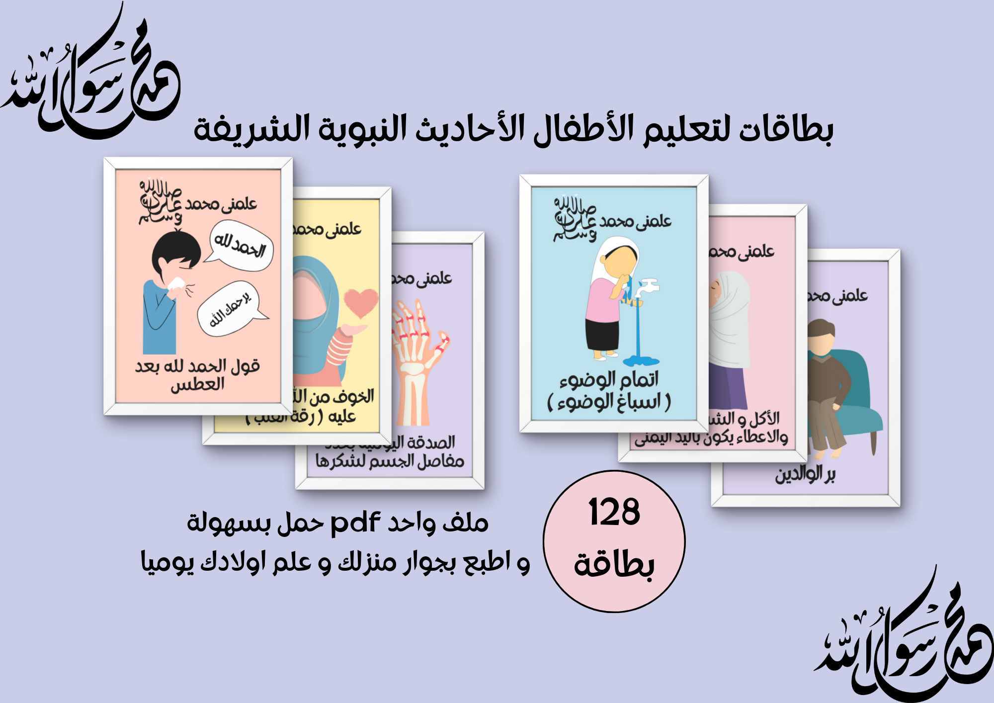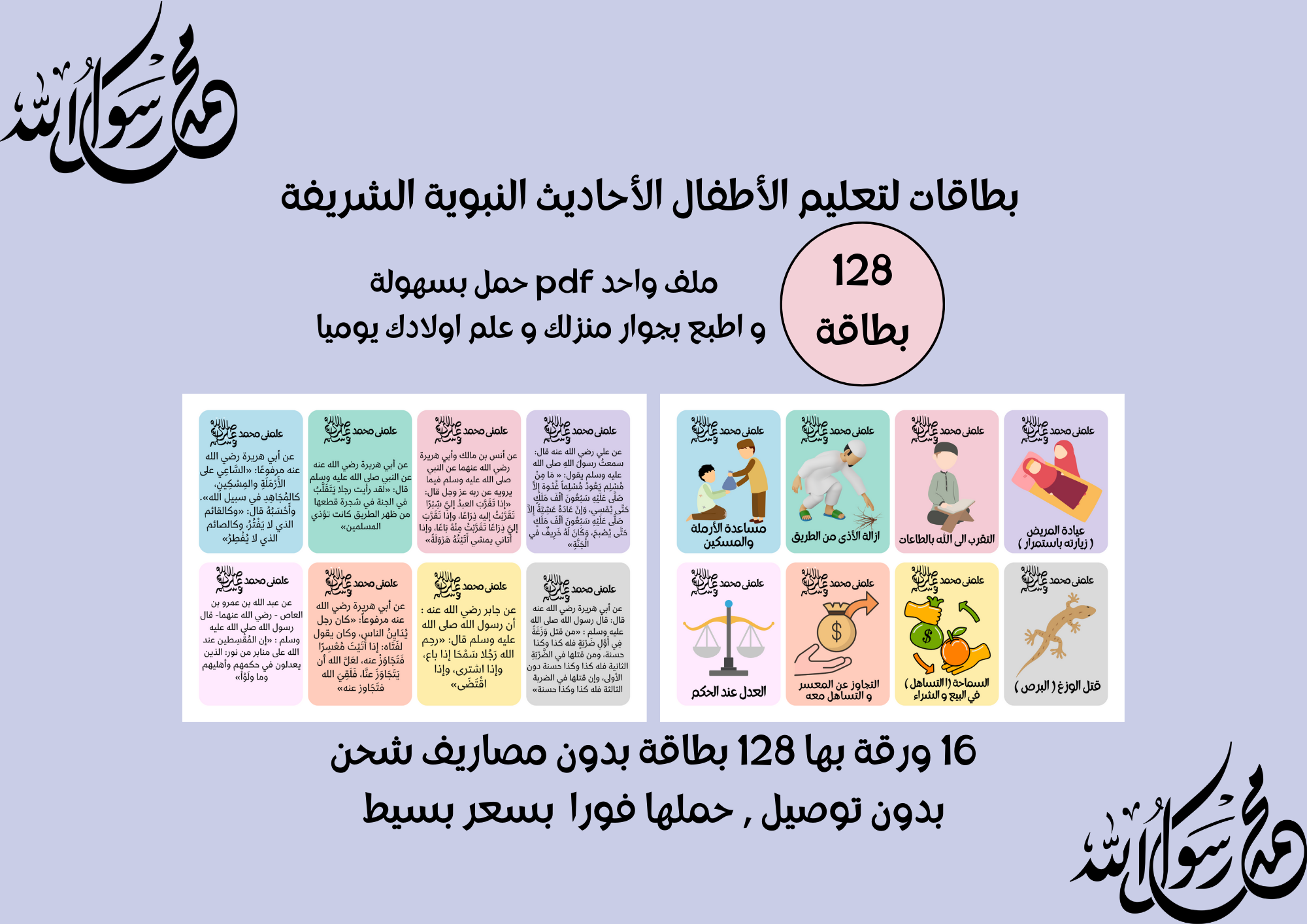 بطاقات لتعليم الاطفال الاحاديث النبوية يوميا بطريقة ممتعة بالصور والالوان الجذابة للاطفال . منتج رقمي عبارة عن ملف pdf يحتوى على 16 ورقة تحتوى على 128 بطاقة يتم طبعها بأى مكتبة بجوارك على ورق دوبلكس أو ورق كانسون ثم قصها و استعملها مع أولادك بشكل يومي . ستحصل على الملف فورا بعد اتمام عملية الشراء ( بدون شحن أو توصيل ) . الاحاديث كلها مذكورة بالسند و يمكنك استعالمها لأطفال و الكبار أيضا .