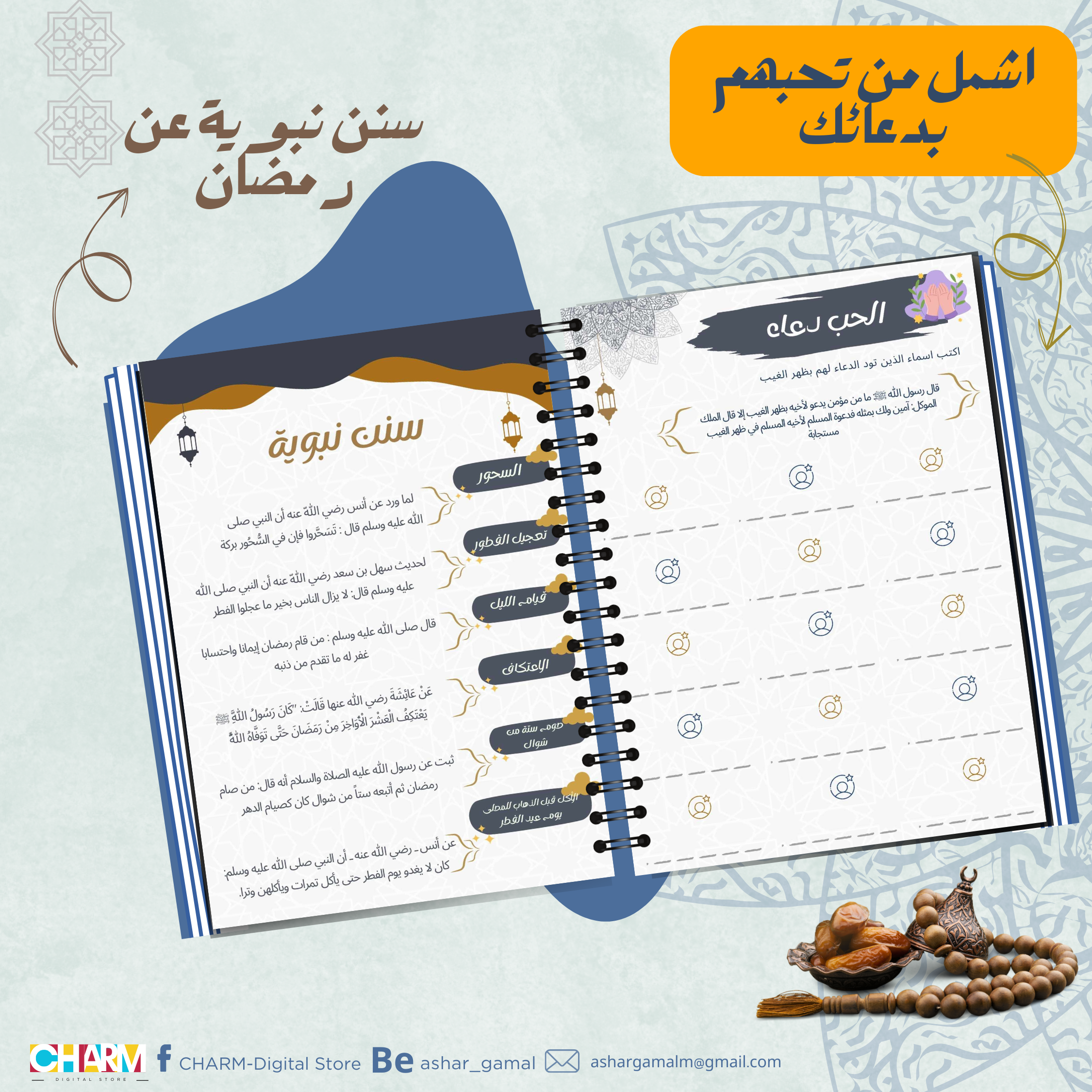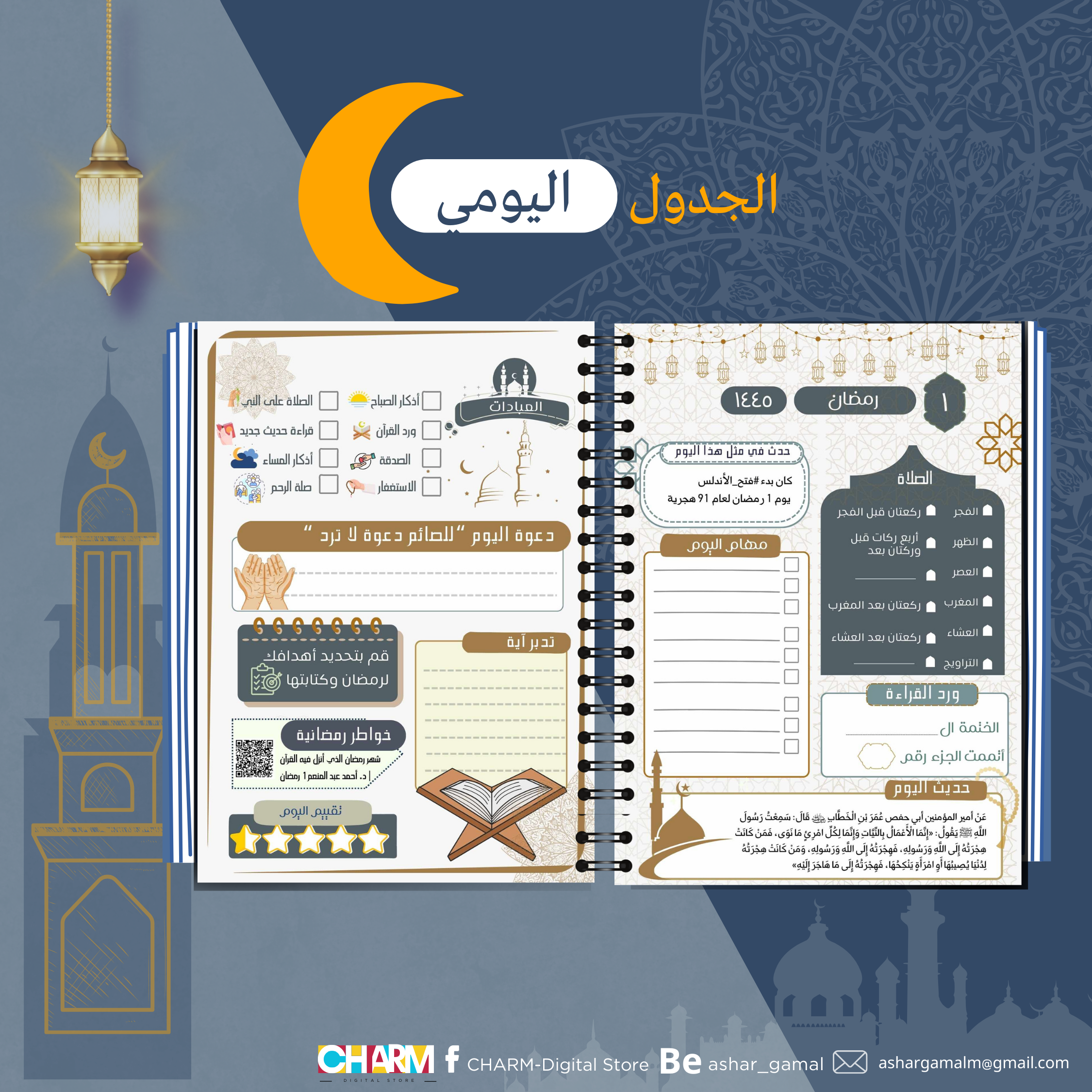 في رمضان، لا تفوت أي فرصة لأداء الفرائض والسنن وأعمال الخير. احصل الآن على بلانر رمضان الخاص بنا الذي يساعدك على تنظيم أيامك بحيث لا تفوتك أي صلاة، قيام، ولا فرصة للعمل الخيري. 🌙❤️